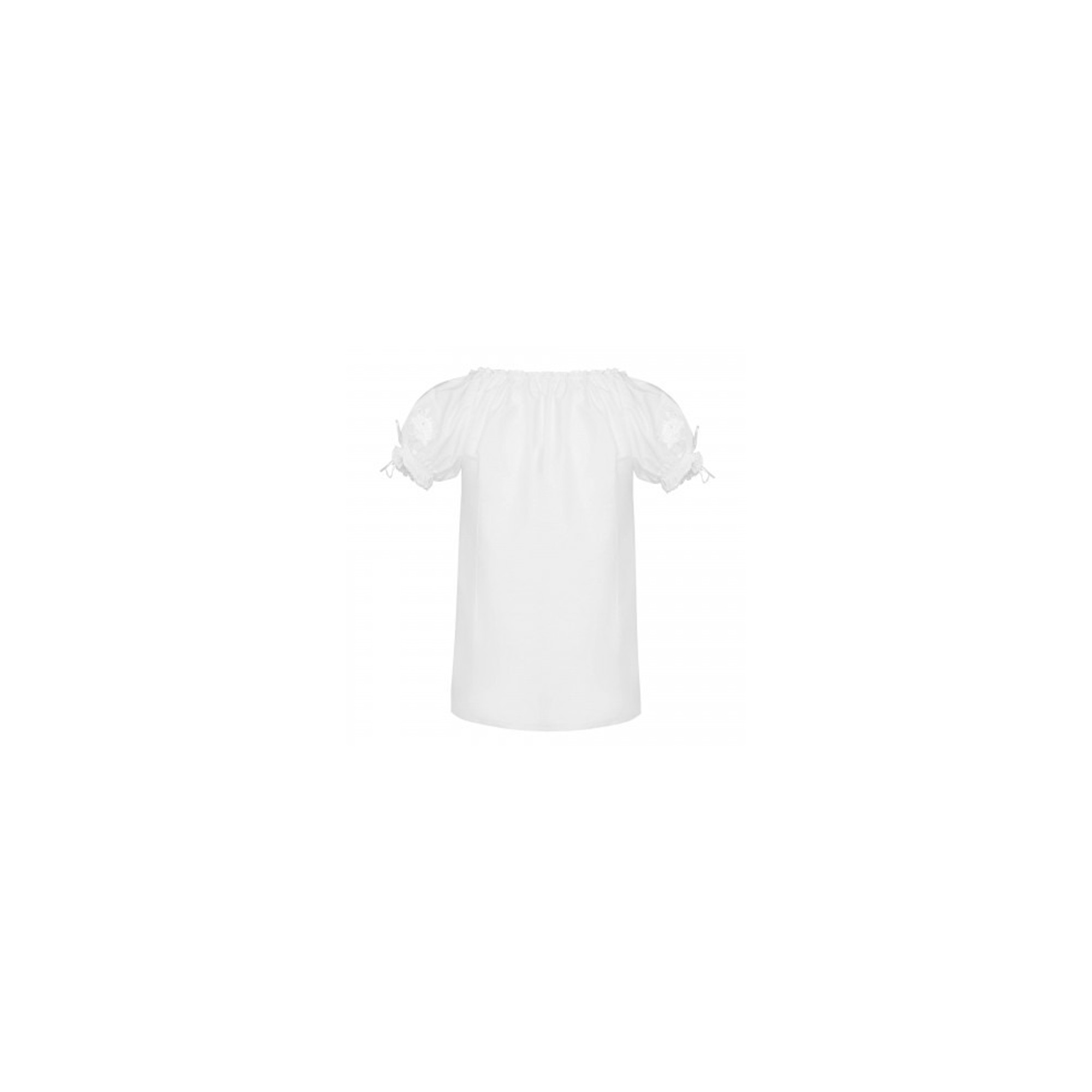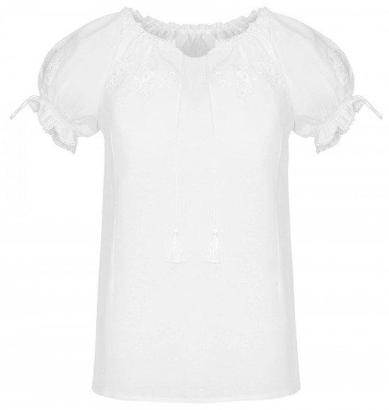 Haftowana biała bluzeczka z białym haftem kwiatowym. Haft umieszczony z przodu bluzki i na rękawach. Oryginalny ludowy krój, krótki bufiasty marszczony rękaw z haftem. Idealna do ludowego stroju i do folkowych stylizacji w połączeniu z dżinsami. Bluzeczka uszyta z bawełny z dodatkiem poliestru, nierozciągliwa.