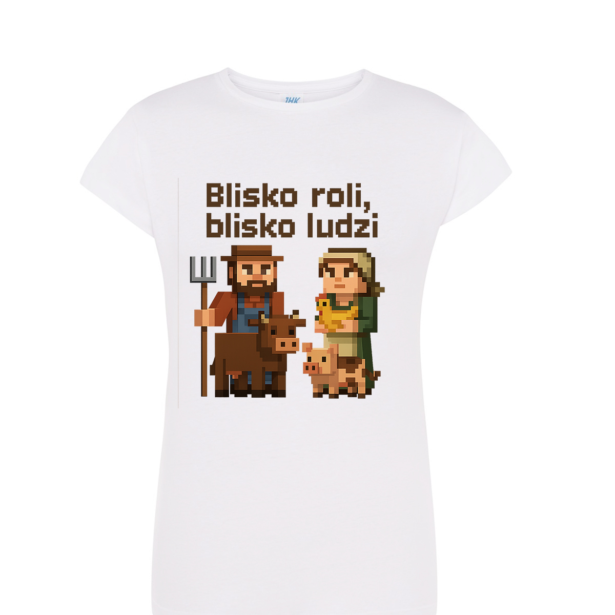Na przedniej części koszulki umieszczono napis „Blisko roli”, który symbolizuje wspólnotę i radość płynącą z bycia razem.