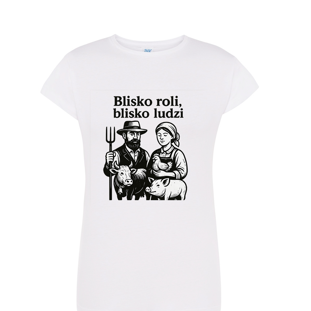Na przedniej części koszulki umieszczono napis „Blisko roli”, który symbolizuje wspólnotę i radość płynącą z bycia razem.
