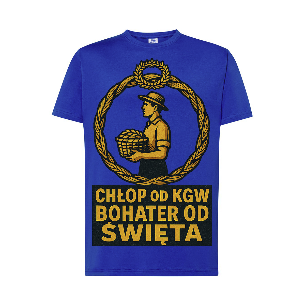 Na przodzie koszulki widnieje oryginalny nadruk w stylu plakatowym – postać mężczyzny w kapeluszu trzymającego kosz pełen plonów, otoczona wieńcem zboża. Całość uzupełnia napis: „CHŁOP OD KGW, BOHATER OD ŚWIĘTA”, który dodaje koszulce humorystycznego, a zarazem wyjątkowego charakteru.