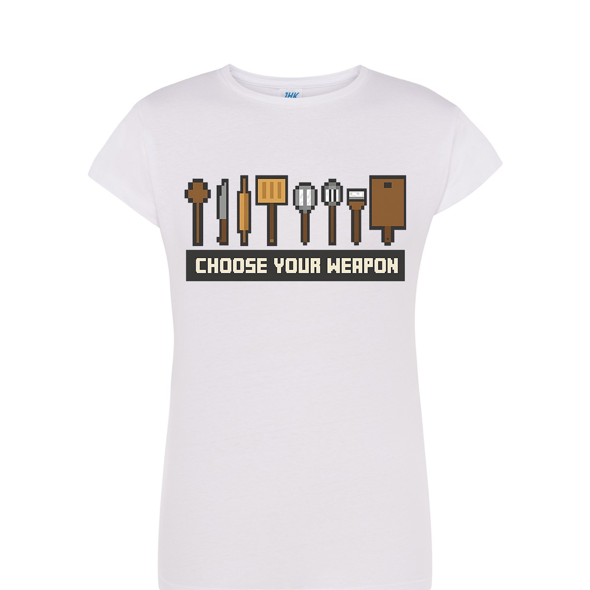 Na przodzie koszulki znajduje się wyjątkowy napis „Choose your weapon”, który dodaje całości charakteru i nuty humoru. To świetna propozycja dla pań, które chcą wyróżnić się w tłumie i podkreślić swoją energię oraz pasję.