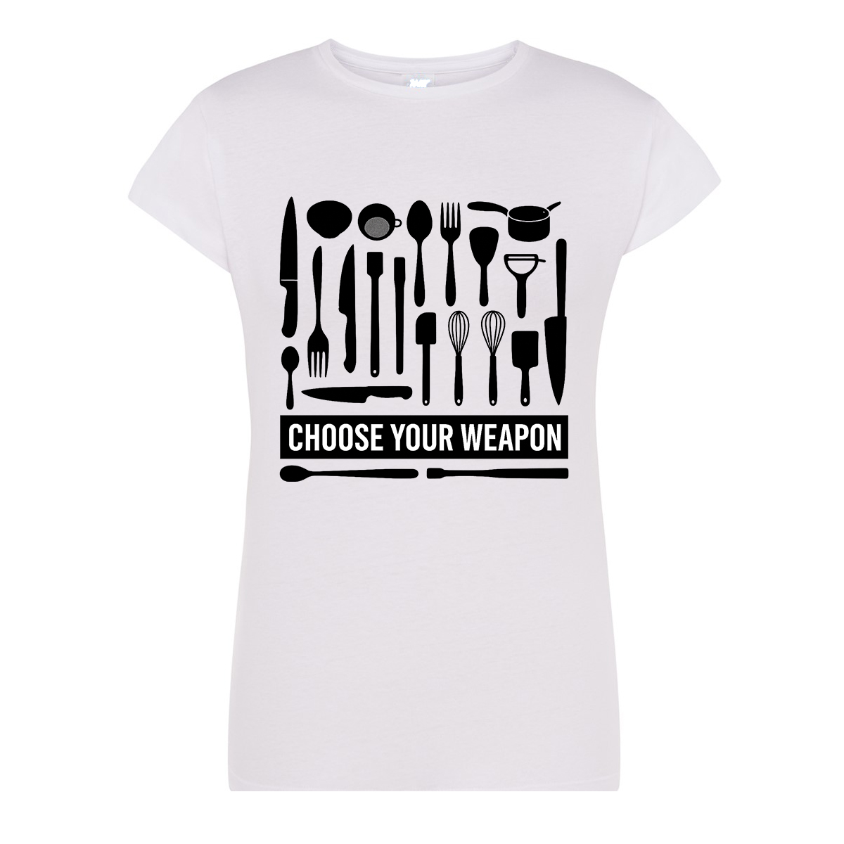 Na przodzie koszulki znajduje się zabawny napis „Choose your weapon” oraz grafika przedstawiająca przedmioty kuchenne – symbol codziennej siły i sprytu każdej gospodyni. To nadruk, który z pewnością wywoła uśmiech i przyciągnie spojrzenia.