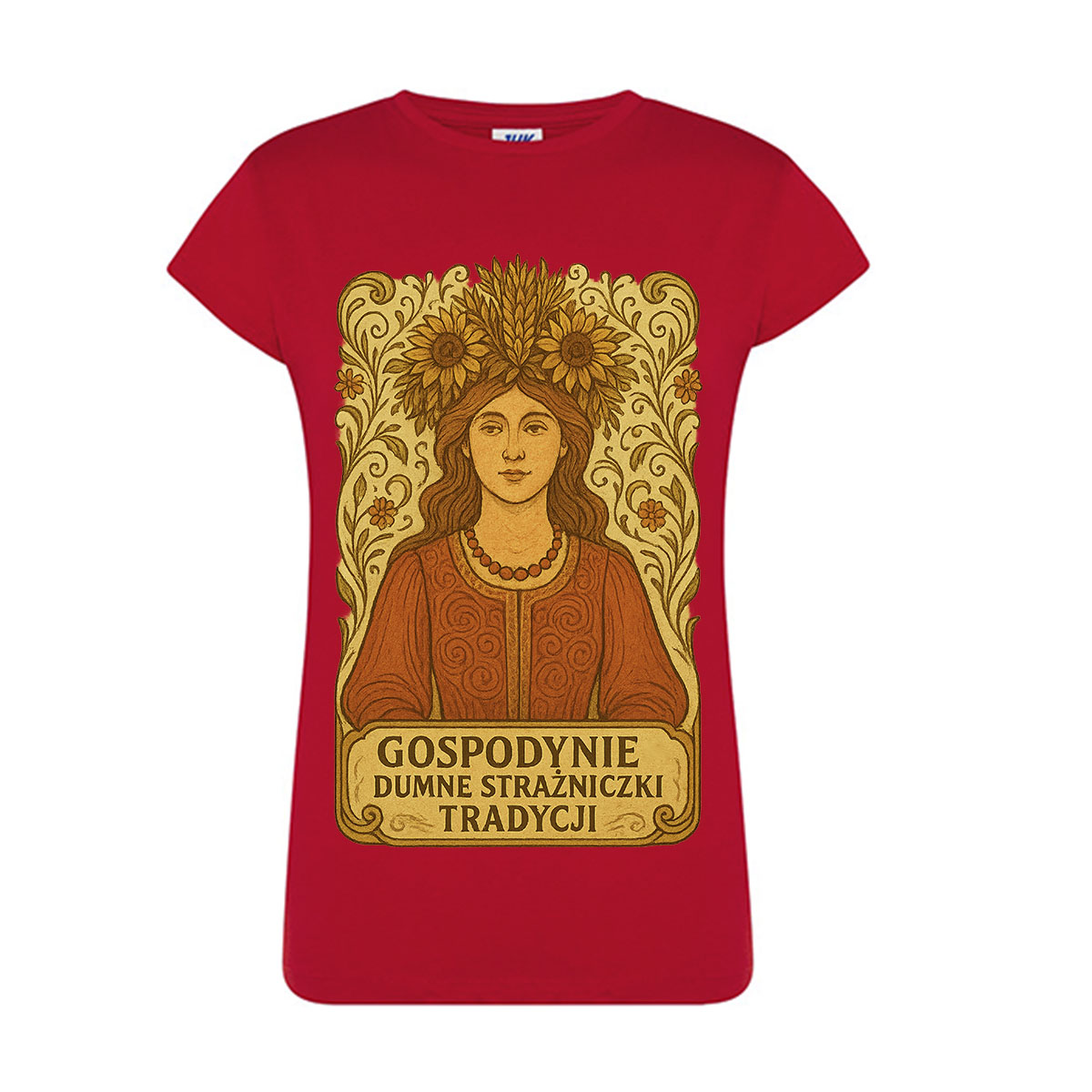 Na przodzie koszulki znajduje się inspirujący napis: „Gospodynie – dumne strażniczki tradycji”, który odzwierciedla połączenie pasji, gościnności oraz siły współczesnych kobiet, które w kuchni i nie tylko dzielą się swoim talentem i sercem.