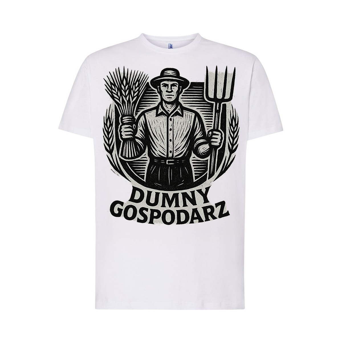 Na froncie koszulki znajduje się grafika przedstawiająca silnego gospodarza trzymającego w jednej ręce snop zboża, a w drugiej widły. Postać otoczona jest liśćmi kłosów, a całość uzupełnia napis „DUMNY GOSPODARZ”, podkreślający charakter i przesłanie wzoru.