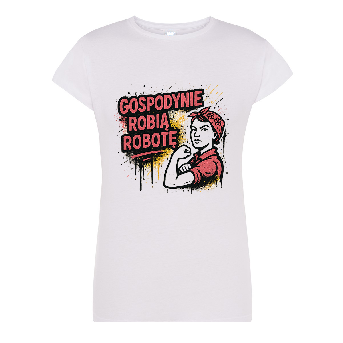 Na przodzie koszulki znajduje się dynamiczny nadruk: napis „Gospodynie robią robotę” oraz grafika kobiety, który w mocny i nowoczesny sposób oddaje charakter i energię gospodyń. To świetny wybór dla tych, które chcą podkreślić swoją siłę i zaangażowanie z nutką humoru.