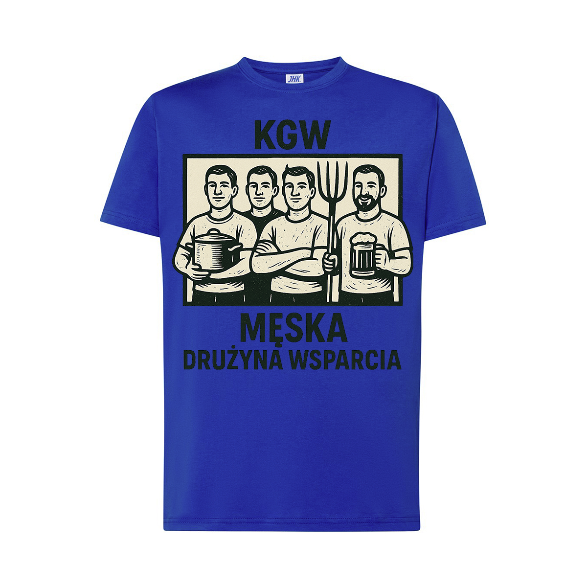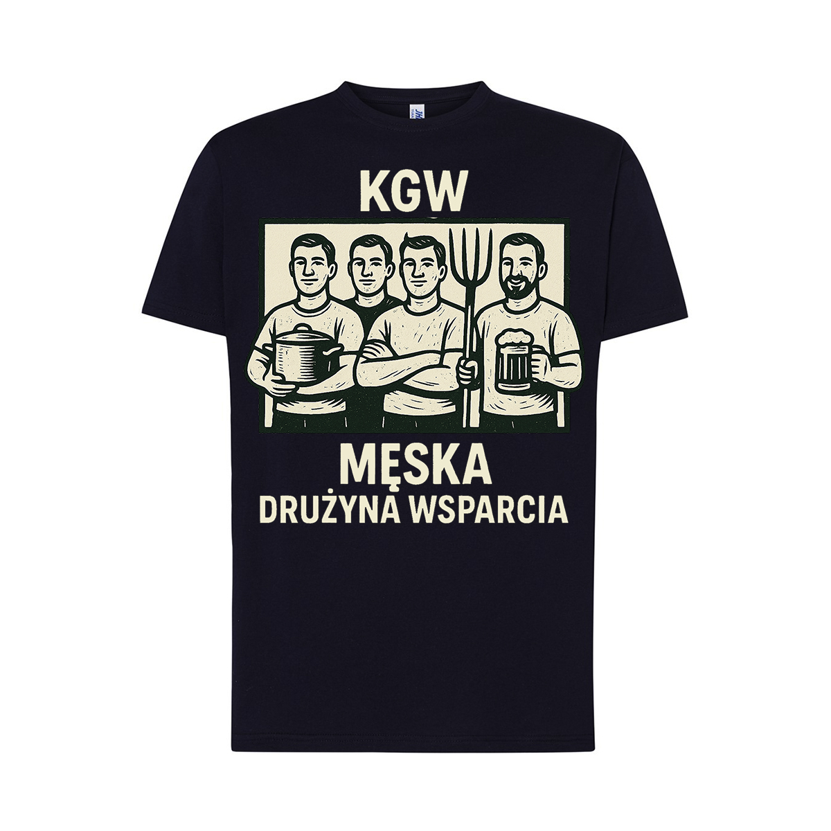 Na przedzie koszulki znajduje się stylizowana ilustracja czterech mężczyzn – każdy trzyma atrybut związany z życiem wiejskim i wsparciem KGW: garnek, widły, kufel piwa oraz zaciśnięte ręce w geście gotowości. Całość utrzymana jest w rustykalnym klimacie, a nad i pod grafiką widnieją napisy: „KGW – Męska Drużyna Wsparcia”. To humorystyczny i jednocześnie symboliczny motyw podkreślający rolę mężczyzn w lokalnej wspólnocie.