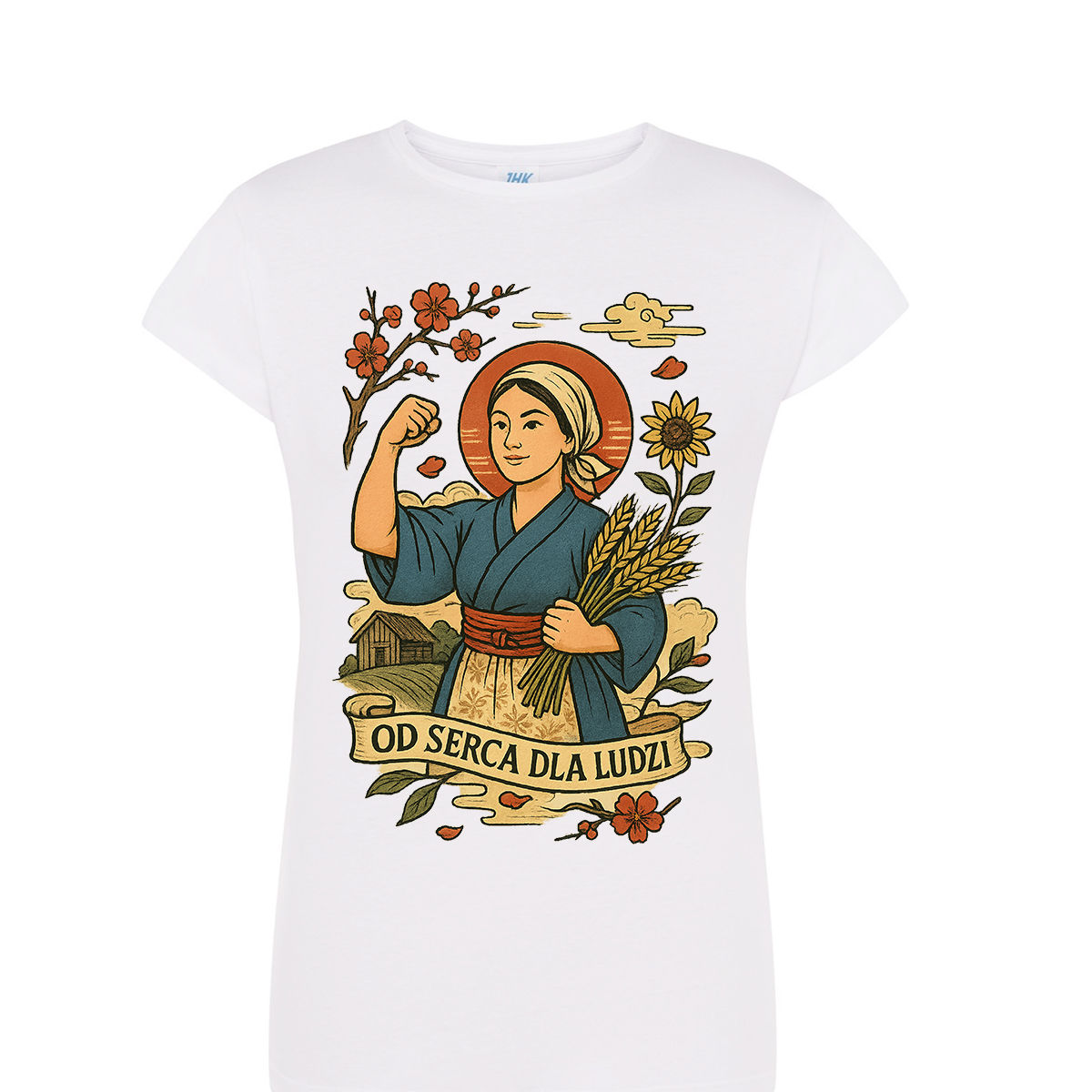 Damski, lekko taliowany krój pięknie układa się na sylwetce, a miękka bawełna o gramaturze 170 g/m² gwarantuje komfort noszenia od rana do wieczora. Na przedzie koszulki widnieje hasło „Od serca dla ludzi”, które symbolizuje otwartość, serdeczność i zaangażowanie gospodyń.