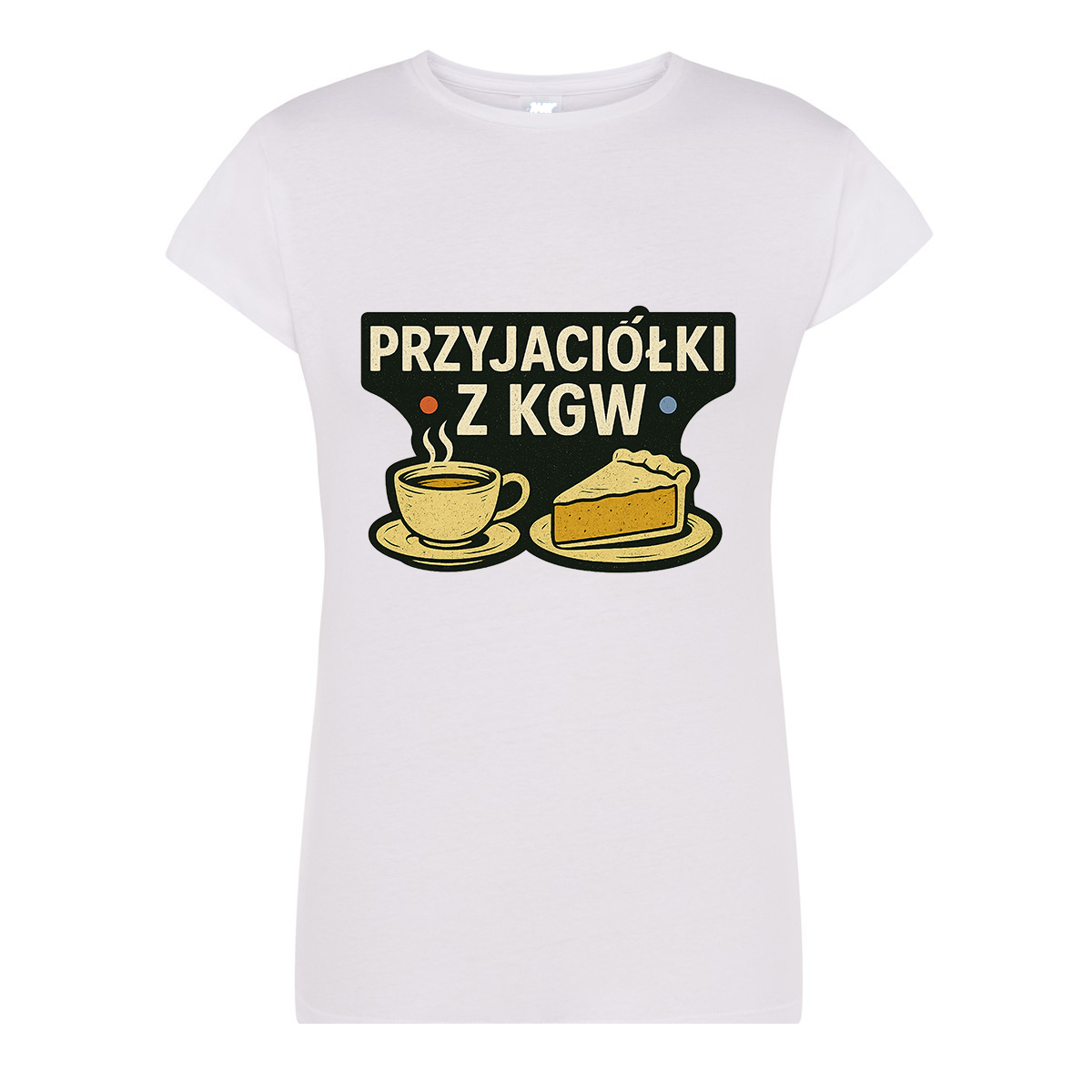 Na przodzie koszulki umieszczono grafikę przedstawiającą ciasto, filiżankę kawy oraz napis „Przyjaciółki z KGW”. To radosny i ciepły motyw, który podkreśla siłę wspólnoty i przyjaźni, łączących gospodynie podczas codziennych i wyjątkowych chwil.