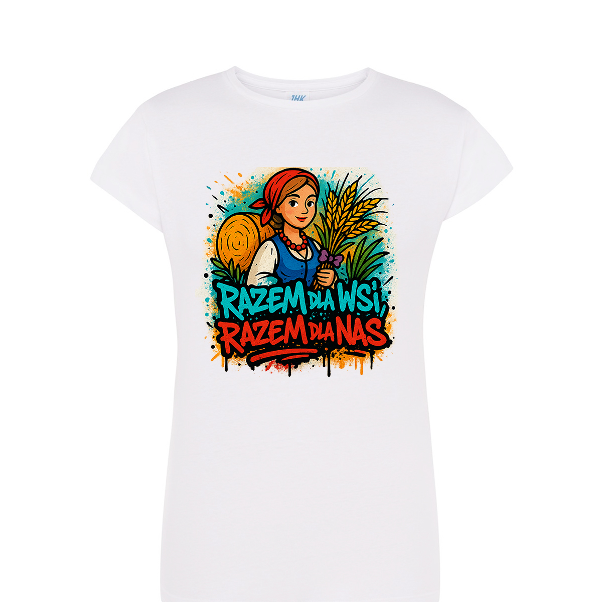 Na przodzie koszulki znajduje się hasło: „Razem dla wsi, razem dla nas” – podkreślające siłę wspólnoty, solidarność i przywiązanie do tradycji.