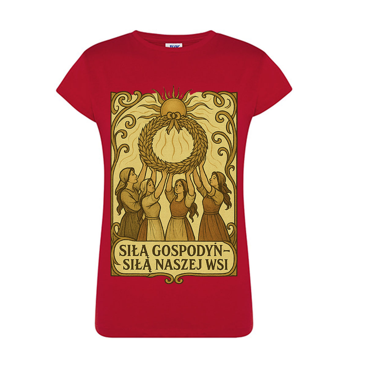 Na przodzie koszulki znajduje się inspirujący napis: „Siła gospodyń – siłą naszej wsi”, który odzwierciedla połączenie pasji, gościnności oraz siły współczesnych kobiet, które w kuchni i nie tylko dzielą się swoim talentem i sercem.