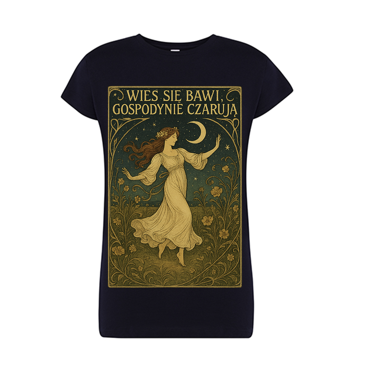 Na koszulce znajduje się artystyczny motyw inspirowany stylem secesyjnym: postać kobiety w białej sukni, tańczącej wśród roślinności pod nocnym niebem, trzymającej w ręku księżyc. Nad nią widnieje napis „WIES SIE BAWI, GOSPODYNIE CZARUJA”, który dodaje uroku i charakteru.