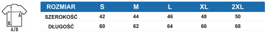 Aby dobrać właściwy rozmiar koszulki najlepiej rozłożyć swoją własną koszulkę na płasko i zmierzyć ją pod pachami oraz od stójki do dołu. Tak zdjęty wymiar porównaj do poniższej tabeli, żeby zobaczyć jakiemu odpowiada rozmiarowi z naszej tabeli.