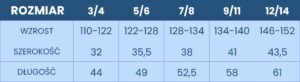 | Rozmiary | 3/4 – 12/14 lat (większa rozmiarówka, patrz tabela) |