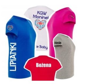 Każda z koszulek może posiadać inny nadruk. U nas macie tę usługę bezpłatnie. Najczęściej wybieranymi personalizacjami nadruku po które sięgają u nas Panie z KGW są: