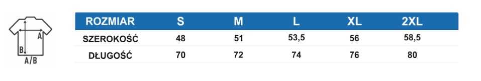 Wymiary mierzone były na koszulach rozłożonych na płasko na stole: szerokość pod pachami, a wysokość od kołnierzyka do dolnej krawędzi koszulki. Możliwa różnica to 1/2cm wynikające z procesu szycia.