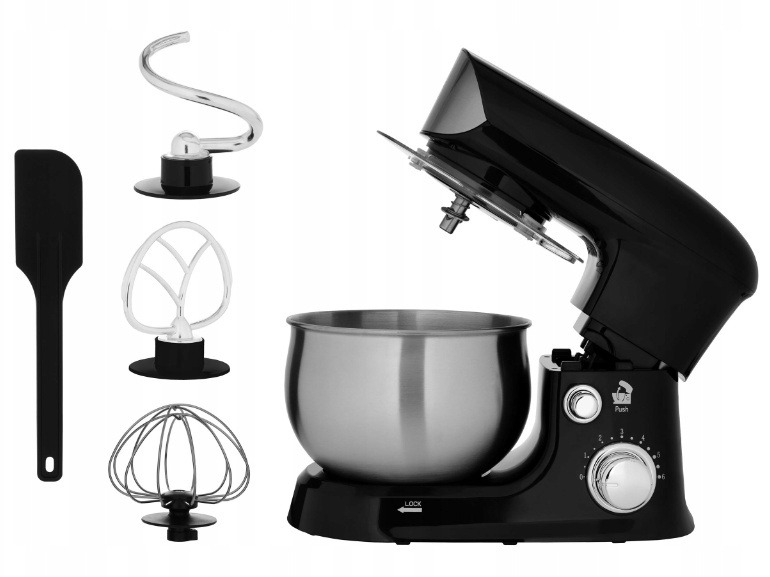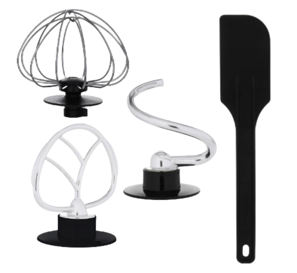 - Trzy wymienne mieszadła – hak, płaski ubijak i trzepaczka – do ciast, kremów i piany.